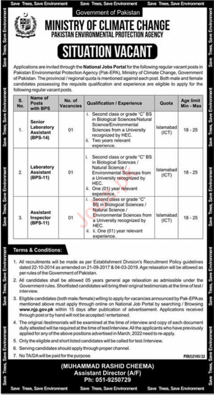 Ministry of Climate Change Islamabad, islamabad Islamabad Pakistan invites applications from eligible candidates for the post of laboratory assistant and assistant inspector as per advertisement of October 2, 2022 published in daily Dunya Newspaper. Candidates with Bachelor etc. educational background will be preferred.