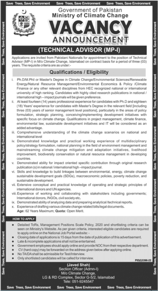 Ministry Of Climate Change Technical Advisor Jobs 2022