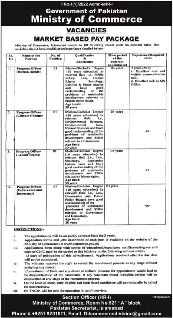 Ministry of Commerce Islamabad, islamabad Islamabad Pakistan invites applications from eligible candidates for the post of program officer climate change, program officer labour right, program officer human right and program officer governance democracy as per advertisement of December 6, 2022 published in daily Dunya Newspaper. Candidates with Master and Bachelor etc. educational background will be preferred.