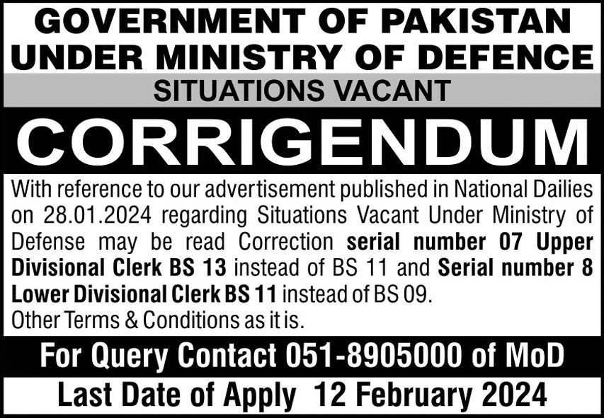 Ministry of Defence invites applications for job positions advertised in daily Express dated 1 February 2024 for following vacancies in Islamabad, islamabad Islamabad Pakistan.