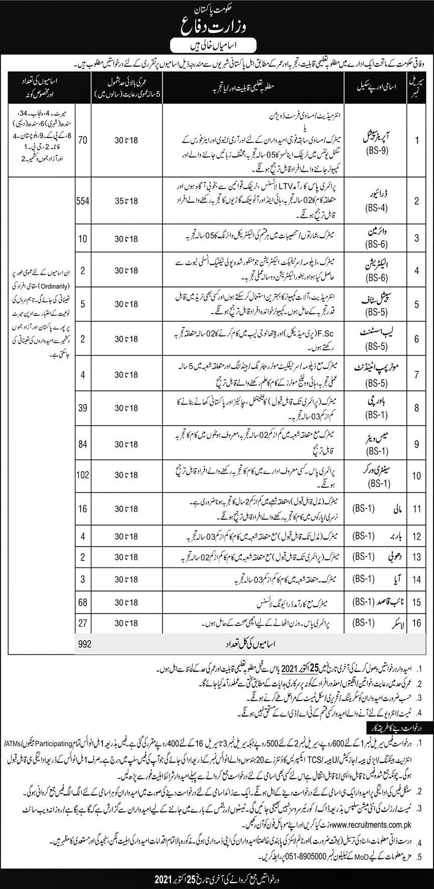 Vacancies in Ministry of Defence Advertisement October 2021