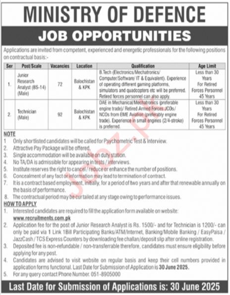 Ministry of Defence Quetta, quetta Balochistan Pakistan invites applications from eligible candidates for the post of research analyst and technician as per advertisement of June 15, 2025 published in daily Jang Newspaper. Preferred Education is Bachelor, DAE and Intermediate etc.