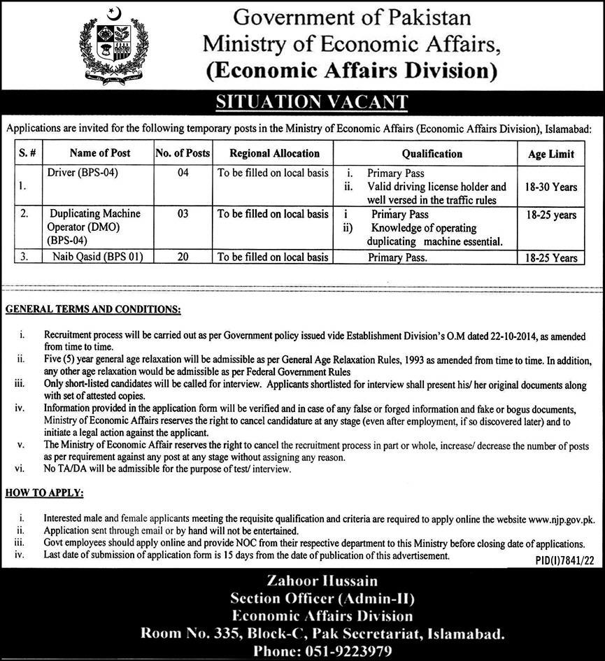 Vacant posts including dmo, driver, duplicating machine operator and naib qasid are announced in Ministry of Economic Affairs Islamabad, islamabad Islamabad Pakistan as per 17 June 2023 advertisement in daily Express Newspaper. Primary etc. educational qualification will be preferred.