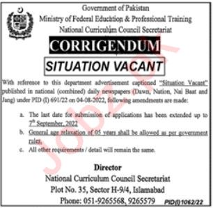 Ministry of Federal Education Jobs 2022 Corrigendum