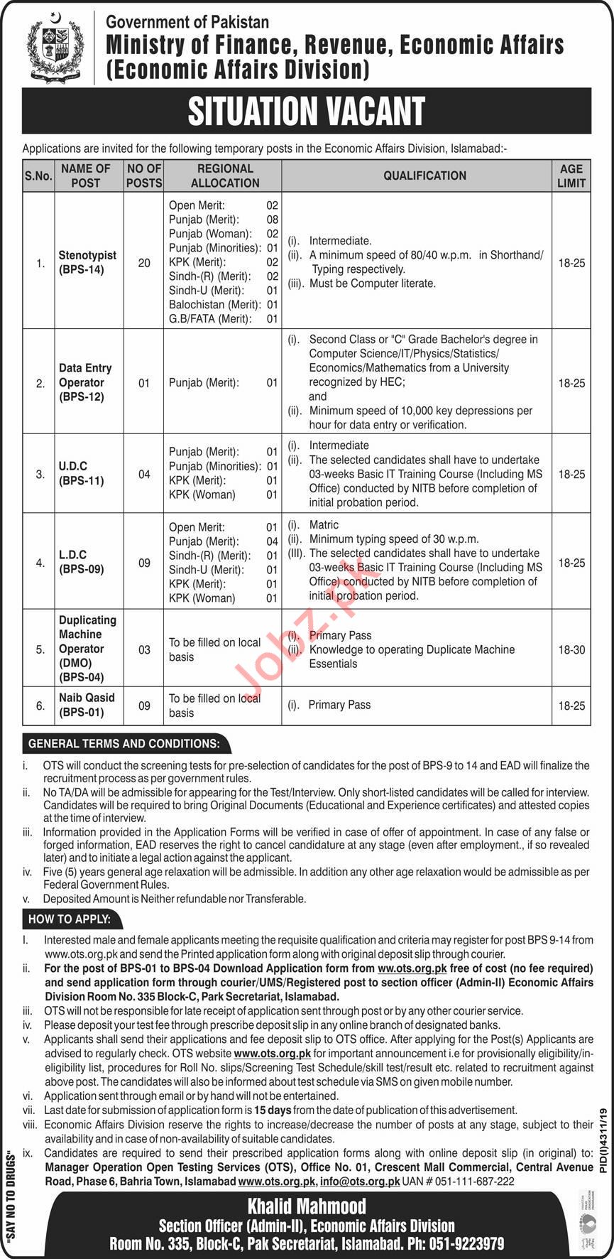 Ministry of Finance, Revenue & Economic Affairs Government of Pakistan Economic Affairs Division invites applications from qualified and experienced candidates for the posts of Steno Typist, Data Entry Operator DEO, Upper Division Clerk UDC, Lower Division Clerk LDC, Duplicating Machine Operator and Naib Qasid in Islamabad through Open Testing Services OTS 2020.