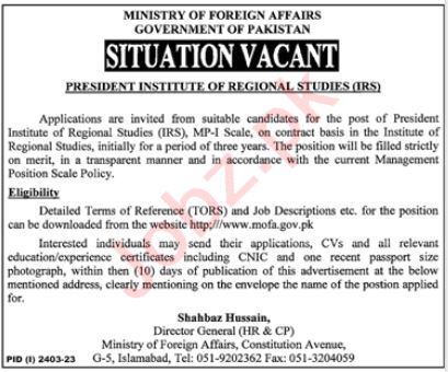 Ministry of Foreign Affairs MOFA Islamabad, islamabad Islamabad Pakistan invites applications from eligible candidates for the post of president institute of regional studies and president as per advertisement of October 22, 2023 published in daily Jang Newspaper. Educational qualifications required Master etc.