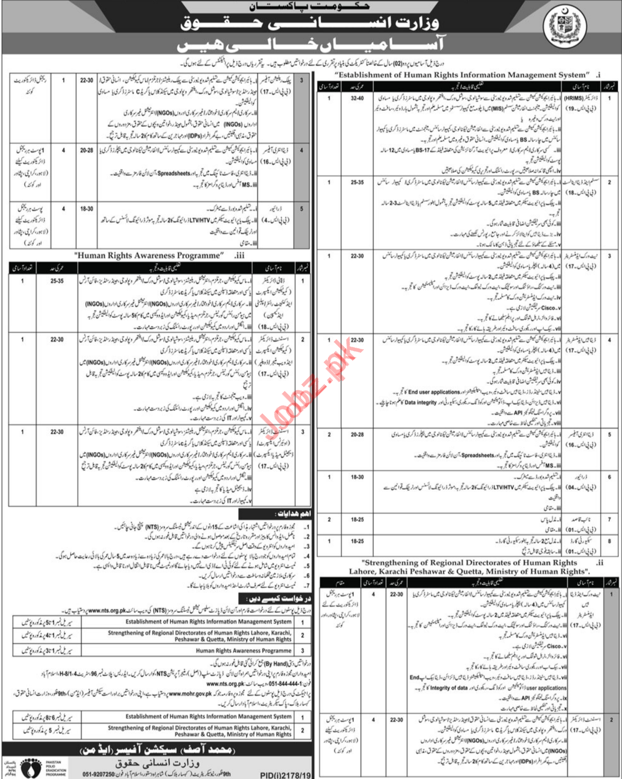 Government of Pakistan, Ministry of Human Rights invites applications from highly qualified individuals for the positions of Director, Public Relation Officer, Data Entry Officer, System Analyst, Data Analyst, Network Administrator, Database Administrator, Naib Qasid, Security Guard, Deputy Director Communication Expert, Deputy Director Content Writer, Deputy Director Publicity, Deputy Director Campaign and Assistant Director in Islamabad through National Testing Services NTS 2019.
