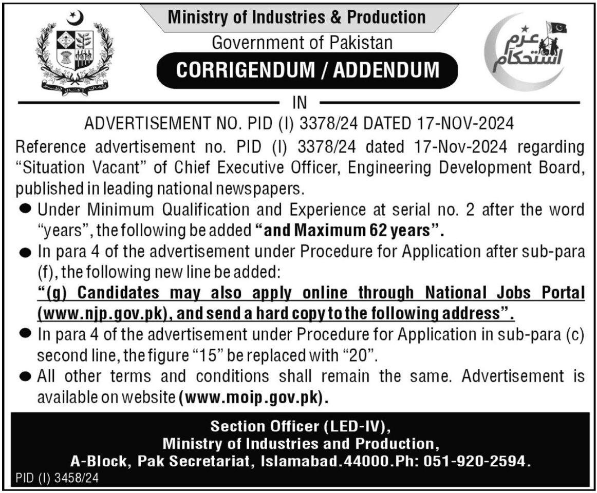 Vacancies in Ministry of Industries and Production Advertisement November 2024