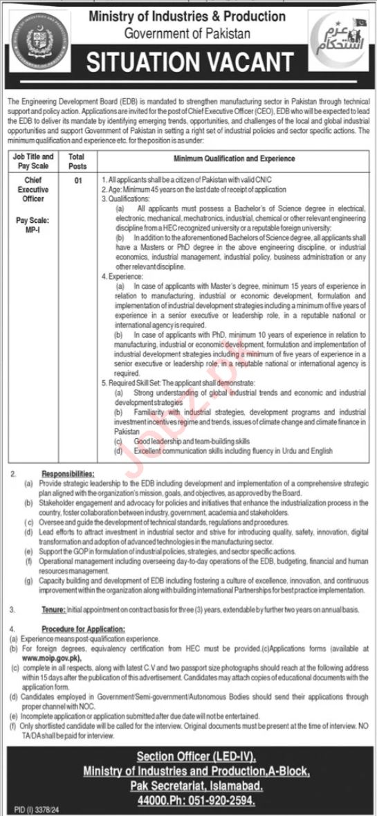 Ministry of Industries and Production Islamabad, islamabad Islamabad Pakistan invites applications from eligible candidates for the post of chief executive officer ceo as per advertisement of November 18, 2024 published in daily Jang Newspaper. Educational qualifications required Bachelor, MS and Master etc.