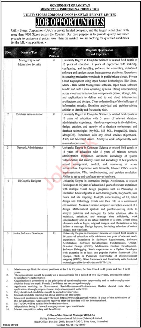 Ministry of Industries and Production jobs advertisement dated about 10 July 2023 in daily Jang Newspaper invites application for the vacant post of manager system, network administrator, software developer, ui graphic designer and database adminstrator in Islamabad, islamabad Islamabad Pakistan. Educational qualifications required MS, Master and Bachelor etc.