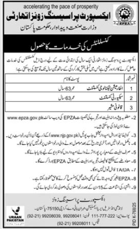 Export Processing Zone, Ministry of Industries and Production jobs advertisement dated about 31 August 2025 in daily Jang Newspaper invites application for the vacant post of consultant, security consultant, legal advisor, information technology consultant and it consultant in Karachi, islamabad Sindh Pakistan. Candidates with Master and Bachelor etc. educational background will be preferred.