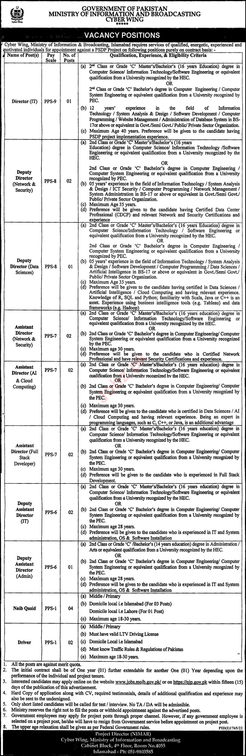 Ministry of Information and Broadcasting jobs advertisement dated about 18 September 2022 in daily Express Newspaper invites application for the vacant post of assistant director stack developer, deputy assistant director admin, deputy assistant director it, deputy director network security, naib qasid, deputy director data science, driver, deputy director it, assistant director cloud computing and director it in Islamabad, islamabad Islamabad Pakistan. Persons with Intermediate, Bachelor, Matric, Primary and Master etc. education can apply.