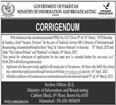 Ministry of Information and Broadcasting invites applications for job positions advertised in daily Jang dated 9 April 2025 for following vacancies in Islamabad, islamabad Islamabad Pakistan.