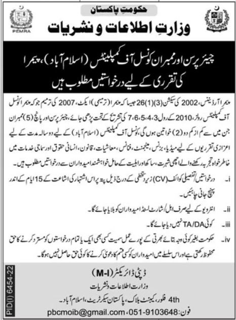 Vacancies in Pakistan Electronic Media Regulatory Authority PEMRA Advertisement April 2023