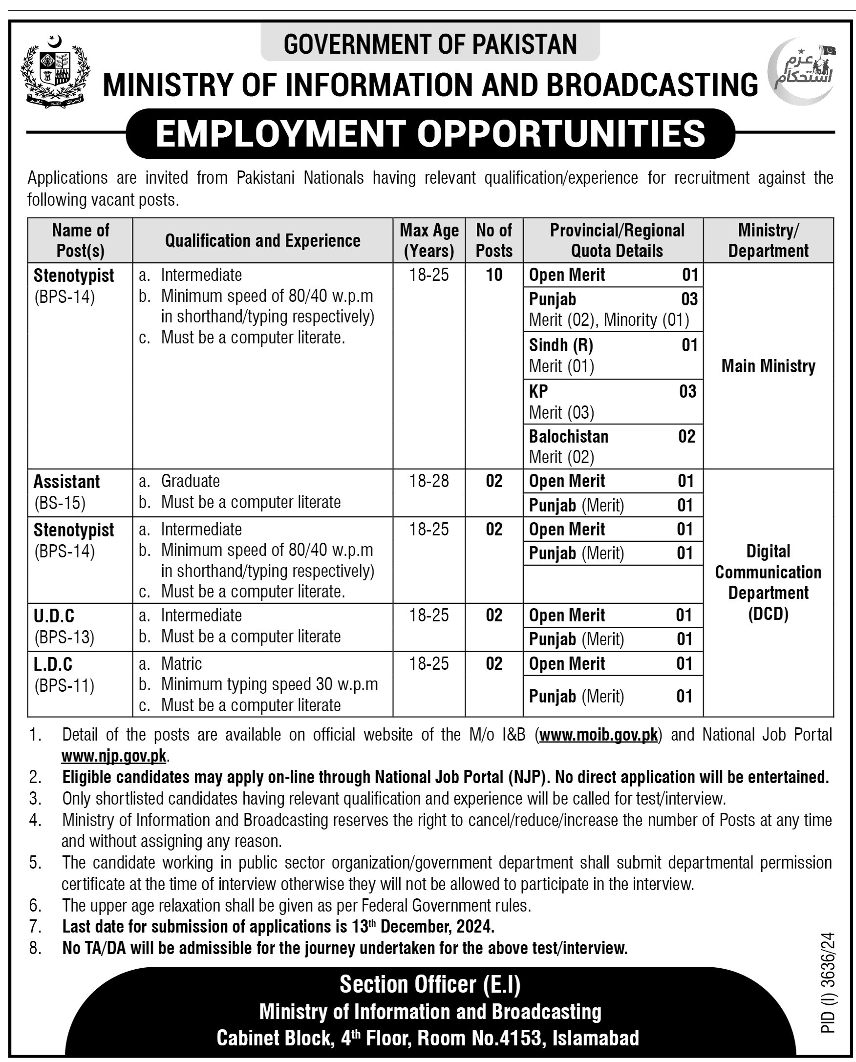 Vacant posts including assistant, udc, ldc and stenotypist are announced in Ministry of Information and Broadcasting Islamabad, islamabad Islamabad Pakistan as per 30 November 2024 advertisement in daily Express Tribune Newspaper. Candidates with DAE, BA, Intermediate, Matric and Bachelor etc. educational background will be preferred.