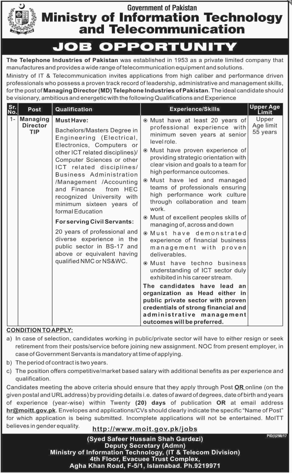 Ministry Of Information Technology & Telecom Islamabad Jobs