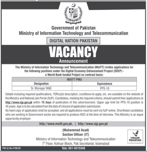 Ministry of Information Technology & Telecommunication MOIT is looking for candidates for following posts as per job advertisement published in daily Ausaf Newspaper of December 8, 2025 for location Islamabad, islamabad Islamabad Pakistan: