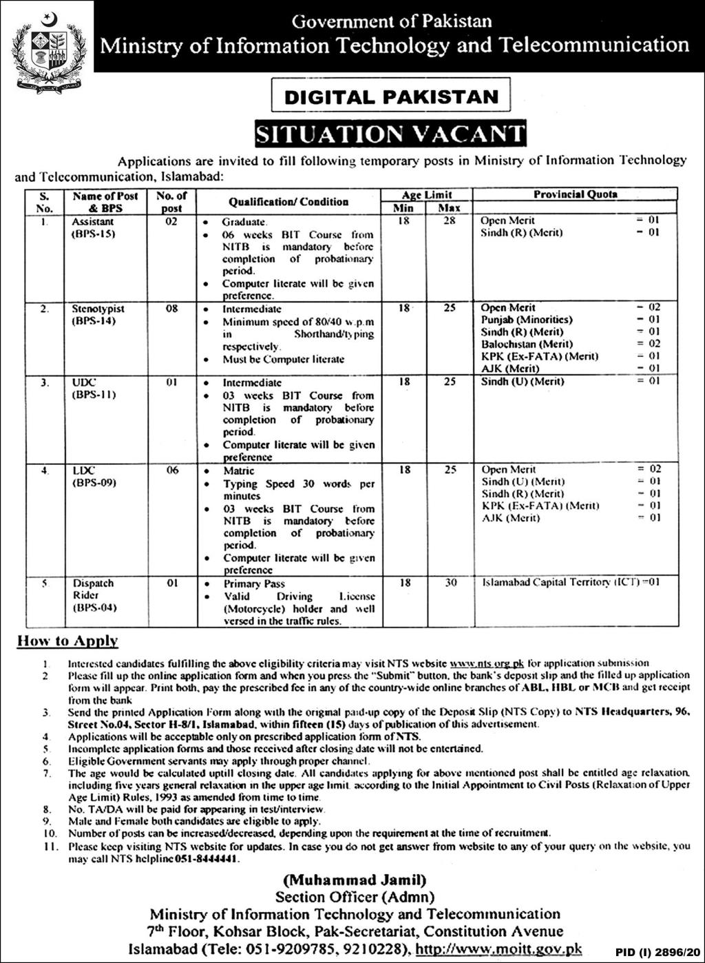 Ministry of Information Technology & Telecommunication Government of Pakistan invites applications from experienced and qualified candidates for the posts of Assistant, Steno Typist, Upper Division Clerk UDC, Lower Division Clerk LDC and Dispatch Rider in Islamabad through National Testing Service NTS 2020.