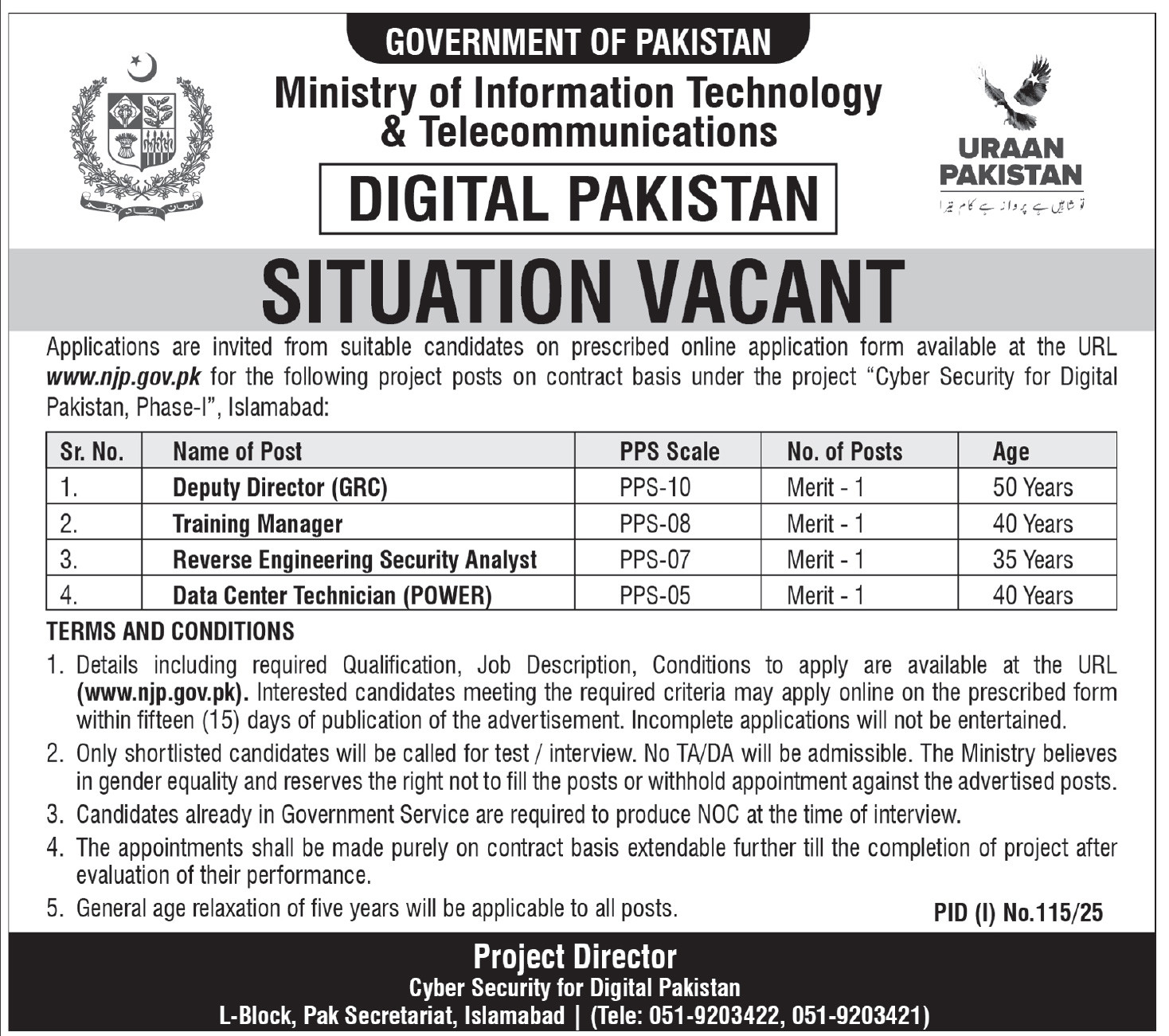 Ministry of Information Technology & Telecommunication MOIT Islamabad, islamabad Islamabad Pakistan invites applications from eligible candidates for the post of data center technician, training manager, reverse engineering security analyst and deputy director grc as per advertisement of July 6, 2025 published in daily Express Tribune Newspaper. MS, Bachelor and Master etc. educational qualification will be preferred.