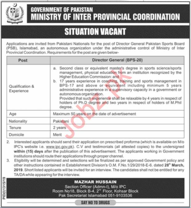 Vacancies in Ministry of Inter Provincial Coordination Advertisement September 2019