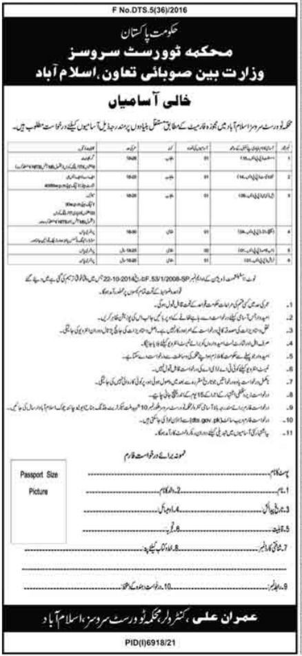 Vacant posts including dispatch rider, farash, ldc, assistant, naib qasid, stenoptypist and lower division clerk are announced in Department of Tourist Services, Ministry of Inter Provincial Coordination Islamabad, islamabad Islamabad Pakistan as per 2 April 2022 advertisement in daily Dunya Newspaper. Persons with Matric, Master, Intermediate, Bachelor and Primary etc. education can apply.