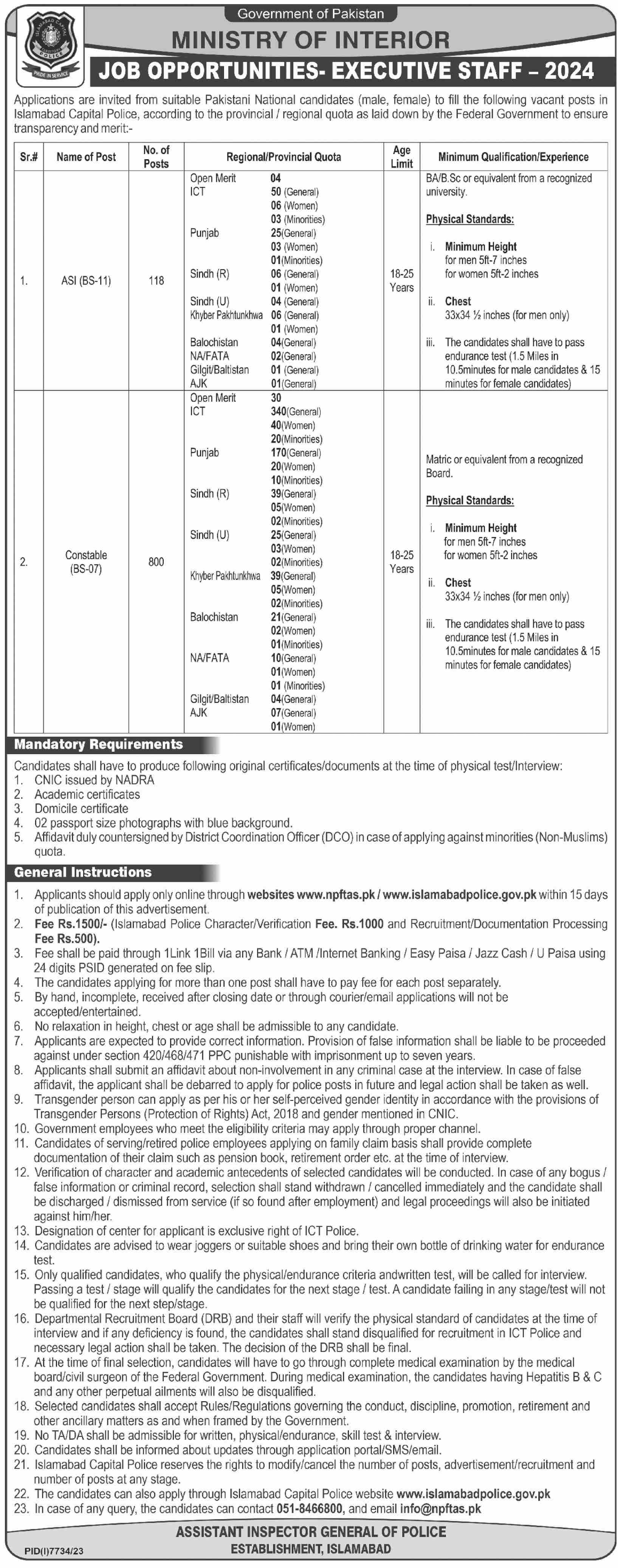 Ministry of Interior Jobs 2024 for ASI & Constable