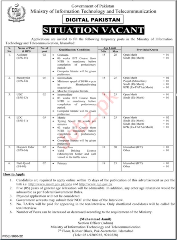 Ministry of Information Technology & Telecommunication MOIT jobs advertisement dated about 26 March 2023 in daily Jang Newspaper invites application for the vacant post of ldc, naib qasid, stenotypist, dispatch rider, assistant and udc in Islamabad, islamabad Islamabad Pakistan. Persons with Primary, Bachelor, Matric and Intermediate etc. education can apply.