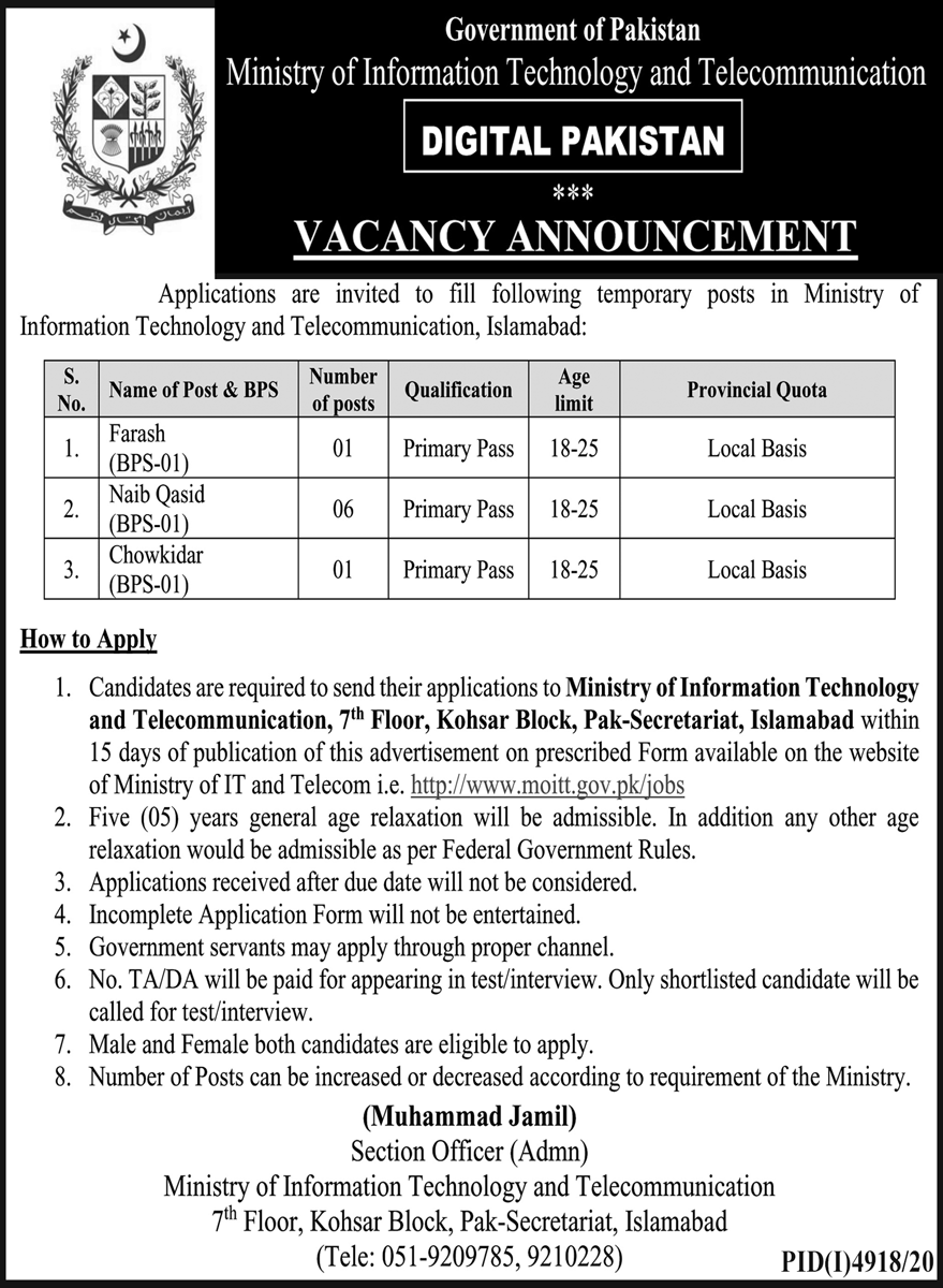 Latest Ministry of Information Technology & Telecommunication MOIT Labor Posts Islamabad 2025
