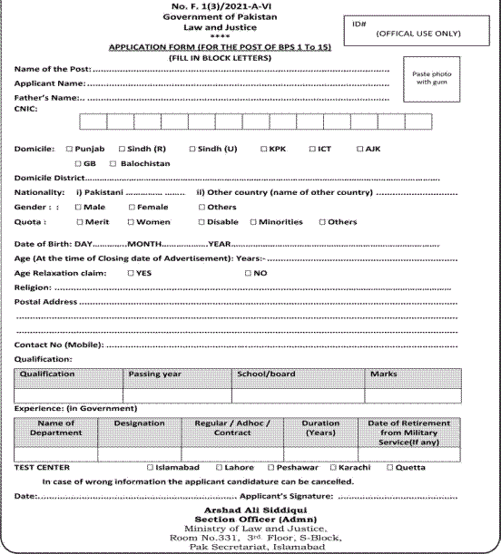 Ministry of Law & Justice Islamabad, Government of Pakistan is seeking candidates for the posts of Assistant, Stenotypist, UDC, Upper Division Clerk, Clerk, Accountant, Cashier, Proof Reader, LDC, Lower Division Clerk, Dispatch Rider, Naib Qasid, Chowkidar, Sanitary Worker.
