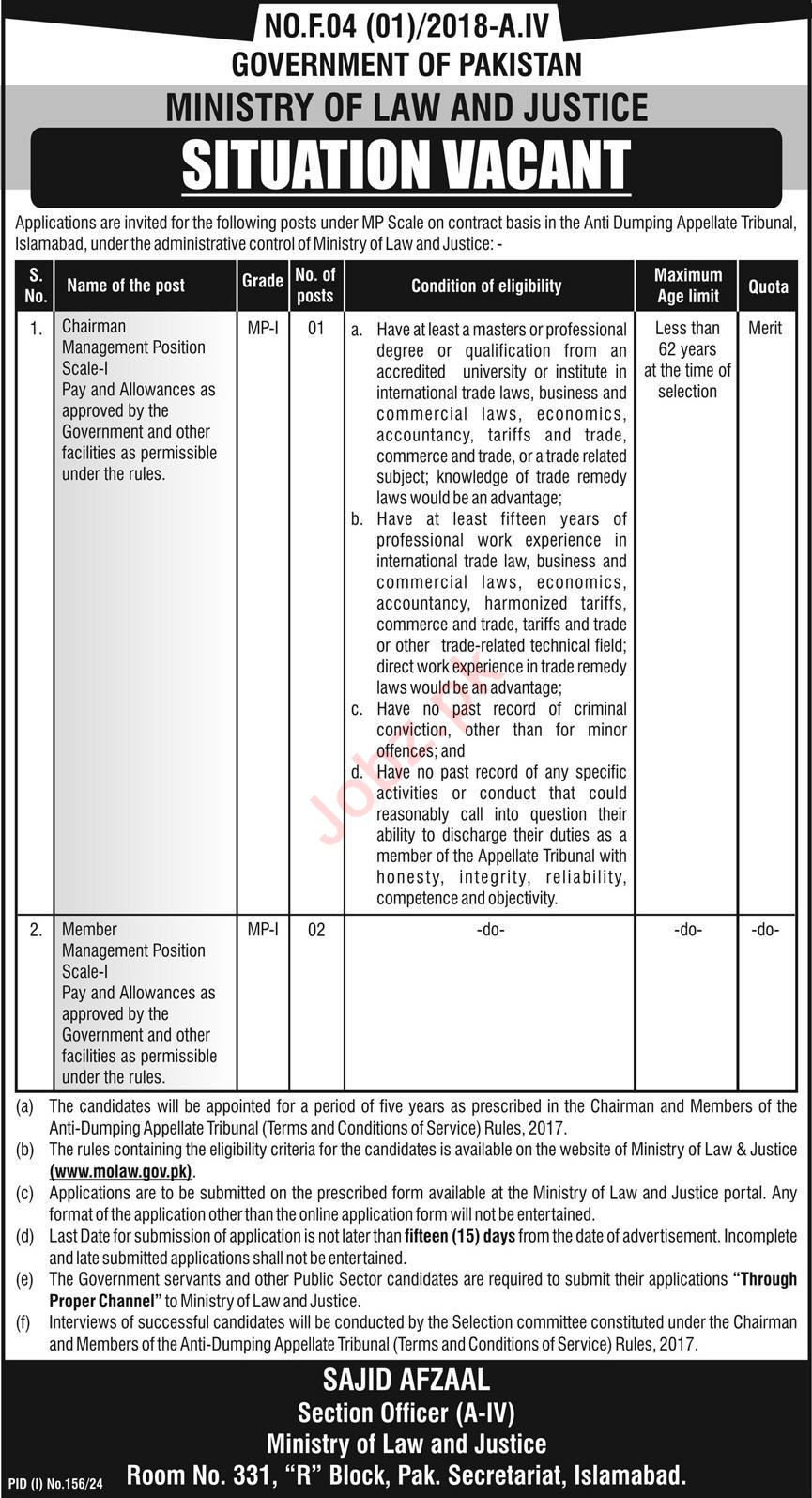 Ministry of Law & Justice Islamabad, islamabad Islamabad Pakistan invites applications from eligible candidates for the post of member and chairman as per advertisement of July 8, 2024 published in daily Express Newspaper. Bachelor, MS and Master etc. educational qualification will be preferred.