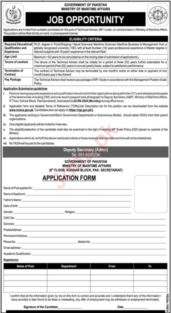 Ministry of Maritime Affairs Islamabad, islamabad Islamabad Pakistan invites applications from eligible candidates for the post of technical advisor as per advertisement of August 18, 2024 published in daily Jang Newspaper. Phd etc. educational qualification will be preferred.