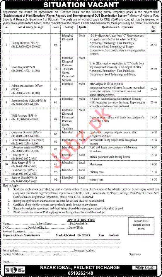 Ministry of National Food Security & Research MNFSR Islamabad, Government of Pakistan is seeking candidates for the posts of Deputy Director, Seed Analyst, Admin Officer, Accounts Officer, Superintendent, Field Assistant, Computer Operator, Lower Division Clerk, LDC, Laboratory Assistant, Driver, Store Keeper, Farash, Sweeper, Security Guard.