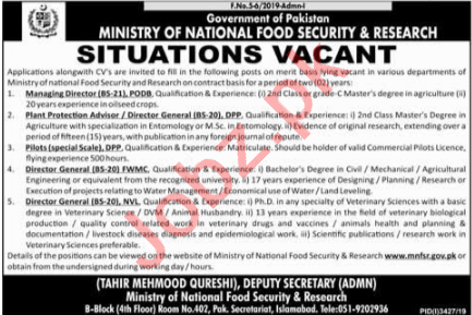 Vacancies in Ministry of National Food Security & Research MNFSR Advertisement December 2019