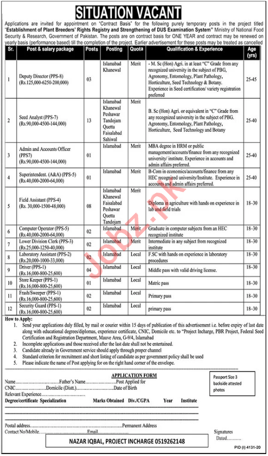 Ministry of National Food Security & Research MNFSR Islamabad, Government of Pakistan seeks services for Deputy Director, Seed Analyst, Admin Officer, Accounts Officer, Superintendent, Field Assistant, Computer Operator, Lower Division Clerk, LDC, Laboratory Assistant, Driver, Store Keeper, Farash, Sweeper, Security Guard.