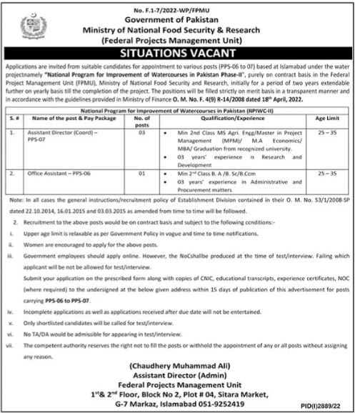 Vacant posts including assistant director and office assistant are announced in Ministry Of National Foods & Security Research Islamabad, islamabad Islamabad Pakistan as per 8 November 2022 advertisement in daily The News Newspaper. Candidates with Bachelor, MS and Master etc. educational background will be preferred.