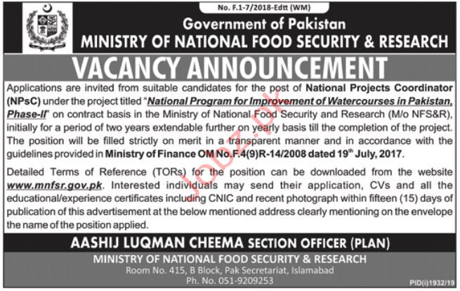 Vacancies in Ministry Of National Foods & Security Research Advertisement October 2019