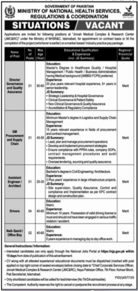 Vacancies in Ministry of National Health Services Regulations & Coordination NHSRC Advertisement December 2025