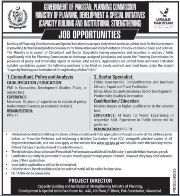 Vacancies in Ministry of Planning Development and Special Initiative Advertisement September 2025