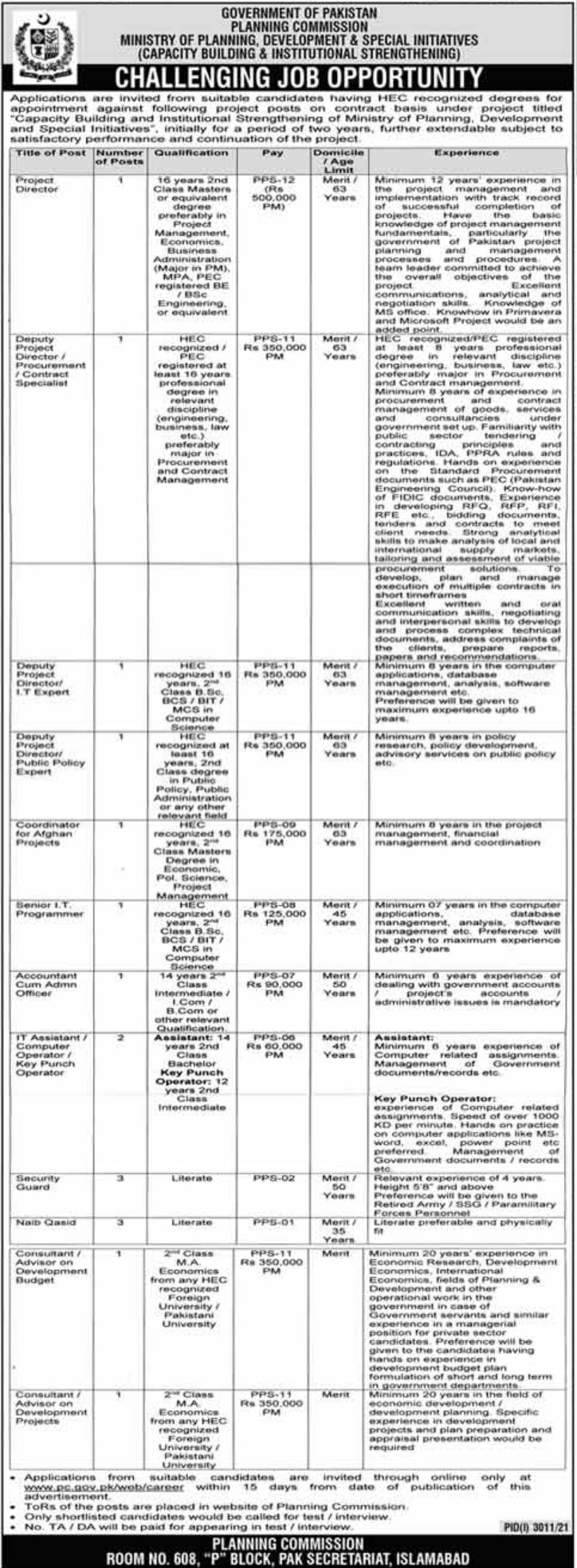 Ministry of Planning Development and Special Initiative is looking for Project Director, Deputy Director, Procurement Director, Contract Specialist, Deputy Project Director IT Expert, Deputy Project Director Public Policy Expert, Afghan Project Coordinator, Senior IT Programmer, Accountant cum Computer Operator, Key Punch Operator, Security Guard, Naib Qasid, Consultant, Advisor on Development Budget, Consultant Advisor on Development Project in Islamabad.