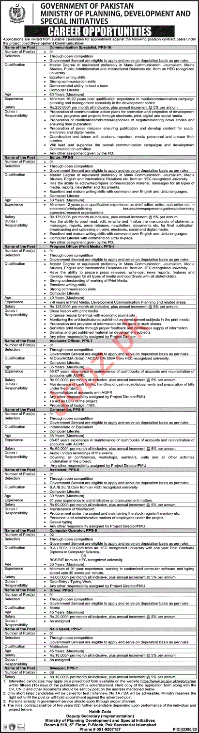 Ministry of Planning Development & Special Initiatives Islamabad, Government of Pakistan is looking for the services from experienced candidates for the posts of Communication Specialist, Editor, Program Officer, Accounts Officer, Cameraman, Assistant, Graphic Designer, Driver, LTV Driver, HTV Driver, Naib Qasid, Sweeper.