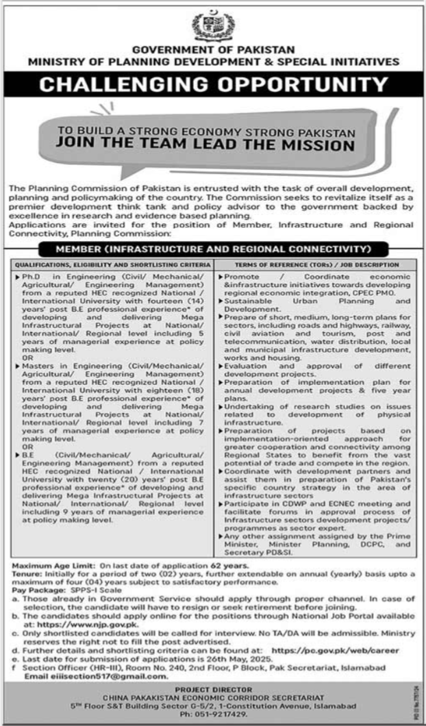 Ministry of Planning Development and Special Initiative jobs advertisement dated about 11 May 2025 in daily Jang Newspaper invites application for the vacant post of member in G-5 Islamabad, islamabad Islamabad Pakistan. Preferred Education is Master, Phd and B.E etc.