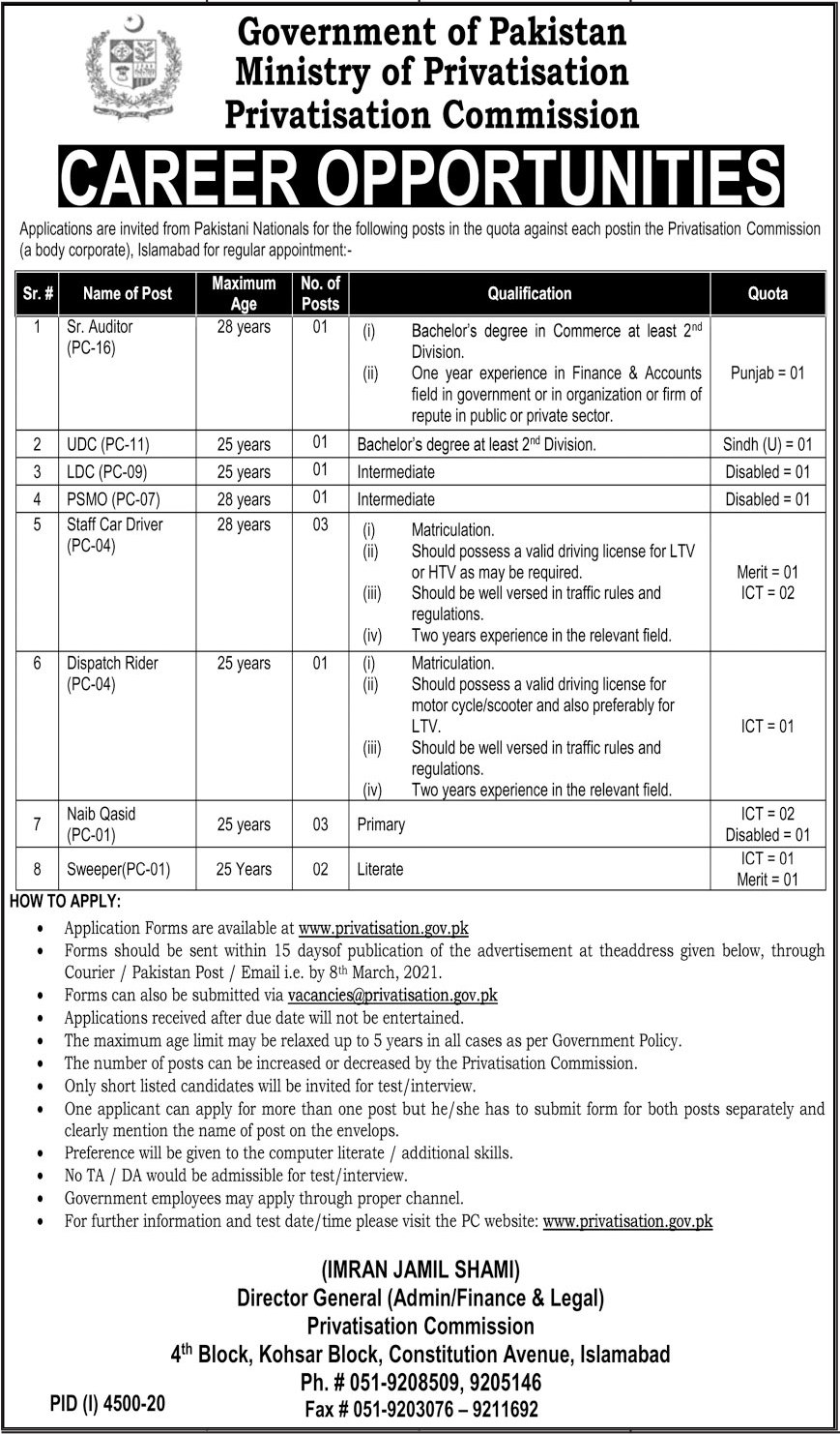 Ministry of Privatisation Government of Pakistan Privatisation Commission is seeking applications from qualified and experienced candidates for the posts of Sr Auditor, Upper Division Clerk UDC, Lower Division Clerk LDC, PSMO, Staff Car Driver, Dispatch Rider, Naib Qasid & Sweeper in Islamabad.