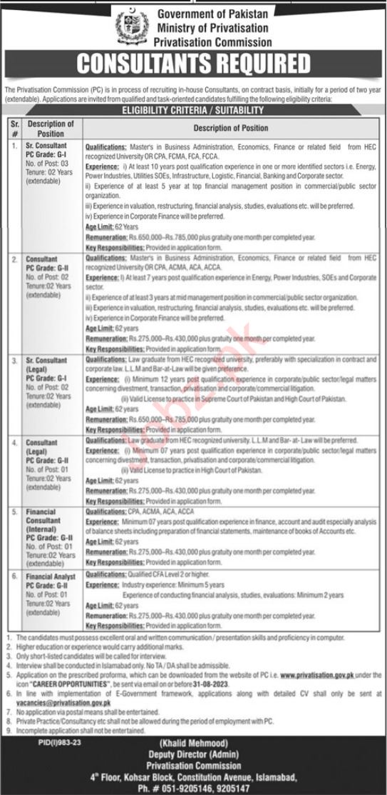 Ministry of Privatisation invites applications for job positions advertised in daily Jang dated 13 August 2023 for following vacancies in Islamabad, islamabad Islamabad Pakistan.