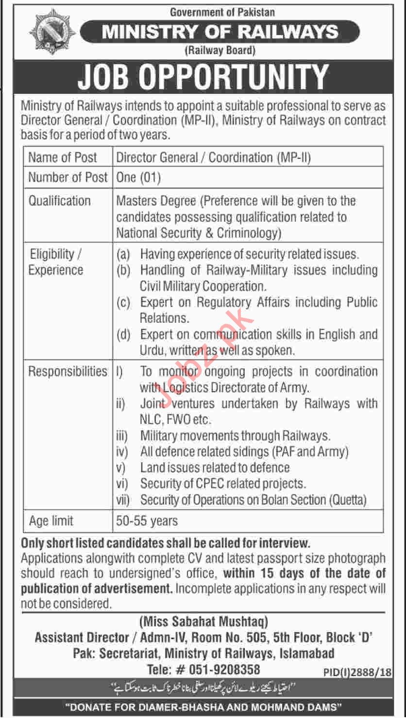 Ministry of Railways Islamabad Jobs 2019 Director General
