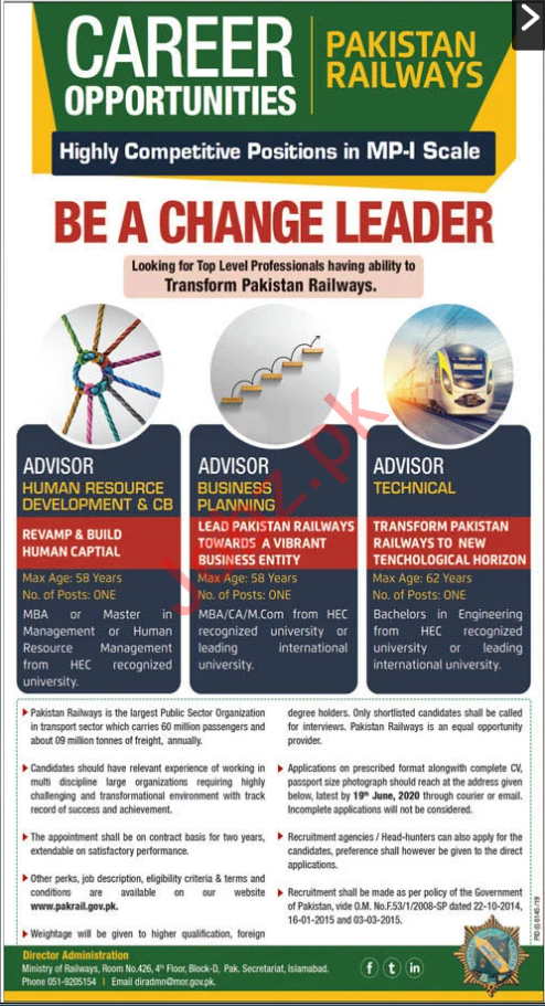 Ministry Of Railways Islamabad Jobs 2020 For Advisors