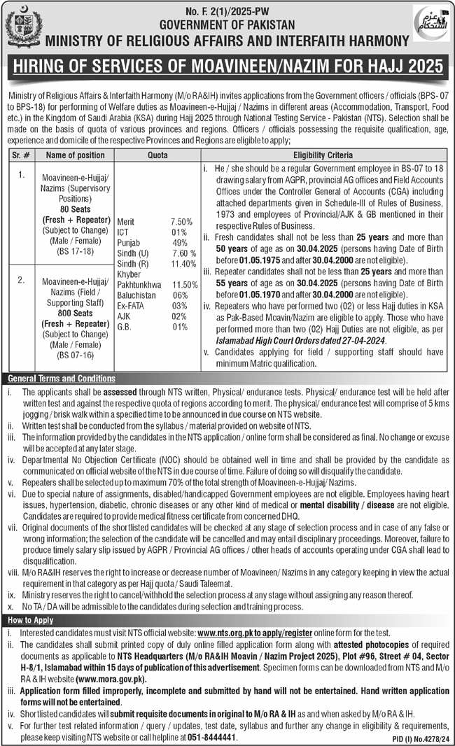 Ministry of Religious Affairs & Interfaith Harmony Islamabad, islamabad Islamabad Pakistan invites applications from eligible candidates for the post of supervisor, moavineen e hujjaj and nazim as per advertisement of December 25, 2024 published in daily Nation Newspaper. Educational qualifications required Bachelor and Master etc.
