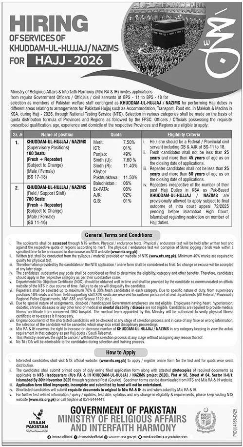 Latest Government jobs in Ministry of Religious Affairs & Interfaith Harmony in Management and others can be applied till 30 November 2025 or as per closing date in newspaper ad. Read complete ad online via NTS to know how to apply on latest Ministry of Religious Affairs & Interfaith Harmony job opportunities.