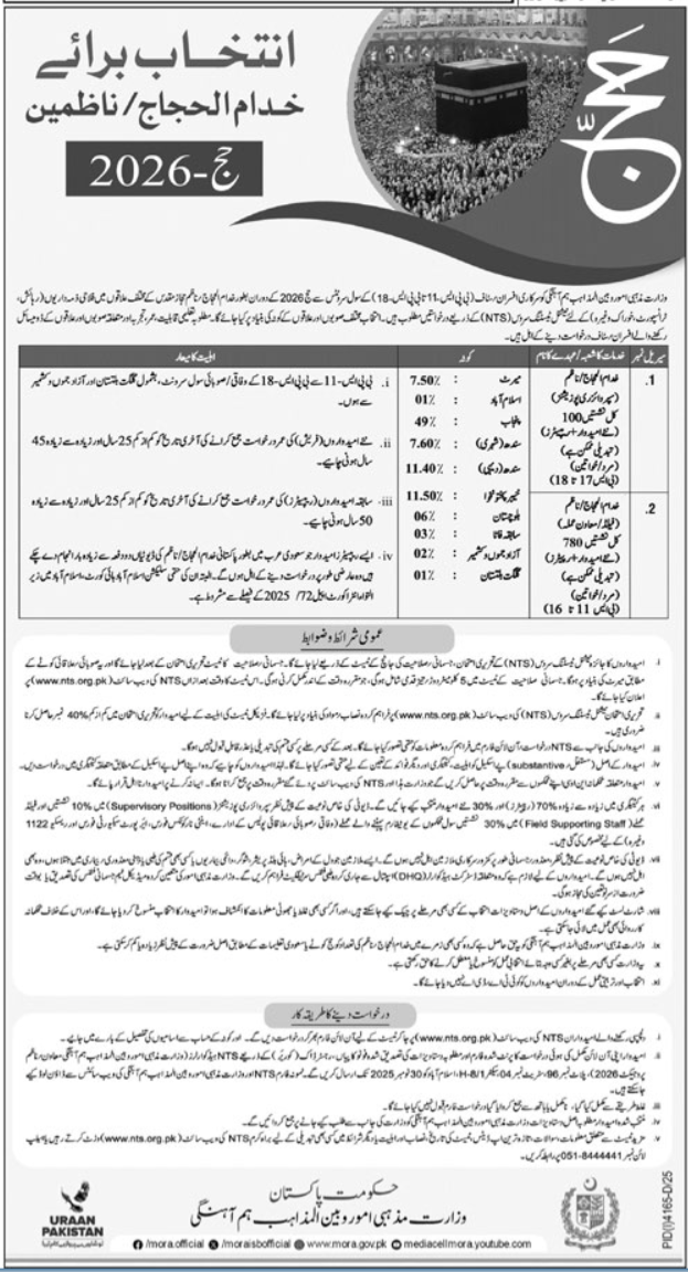 Ministry of Religious Affairs & Interfaith Harmony jobs advertisement dated about 20 November 2025 in daily Ausaf Newspaper invites application for the vacant post of Khuddam Ul Hujjaj and Nazim in Islamabad, islamabad Islamabad Pakistan. Educational qualifications required Matric and Intermediate etc.