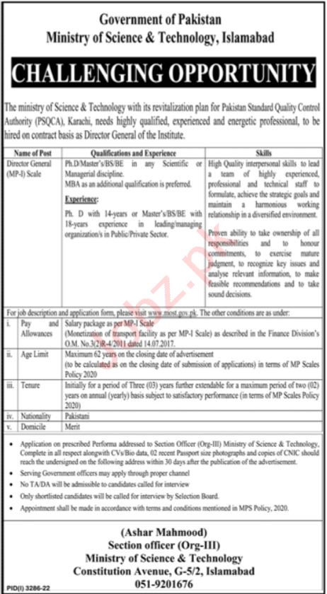 Vacant posts including director general are announced in Ministry of Science and Technology MOST Islamabad, islamabad Islamabad Pakistan as per 27 November 2022 advertisement in daily Jang Newspaper. BA, B.E, Bachelor, Master and Phd etc. educational qualification will be preferred.