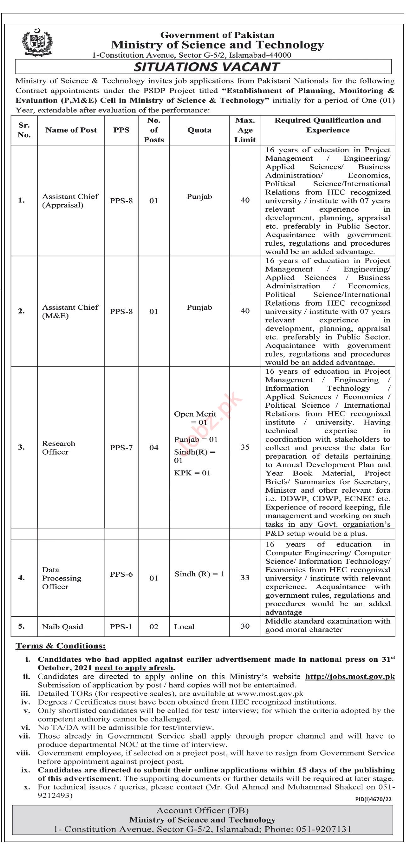 Vacancies in Ministry of Science and Technology MOST Advertisement January 2023